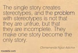 This has begun to be one of my favorite quotes. Ive heard it many times in different classes, but it being something that I personally relate too it is so great to see something that I experience put into words provides a feeling of being understood. I also think that this is something that most people can relate to but don’t realize that they are experiencing. Stereotypes contain some truth but how do we keep it from being the only truth?